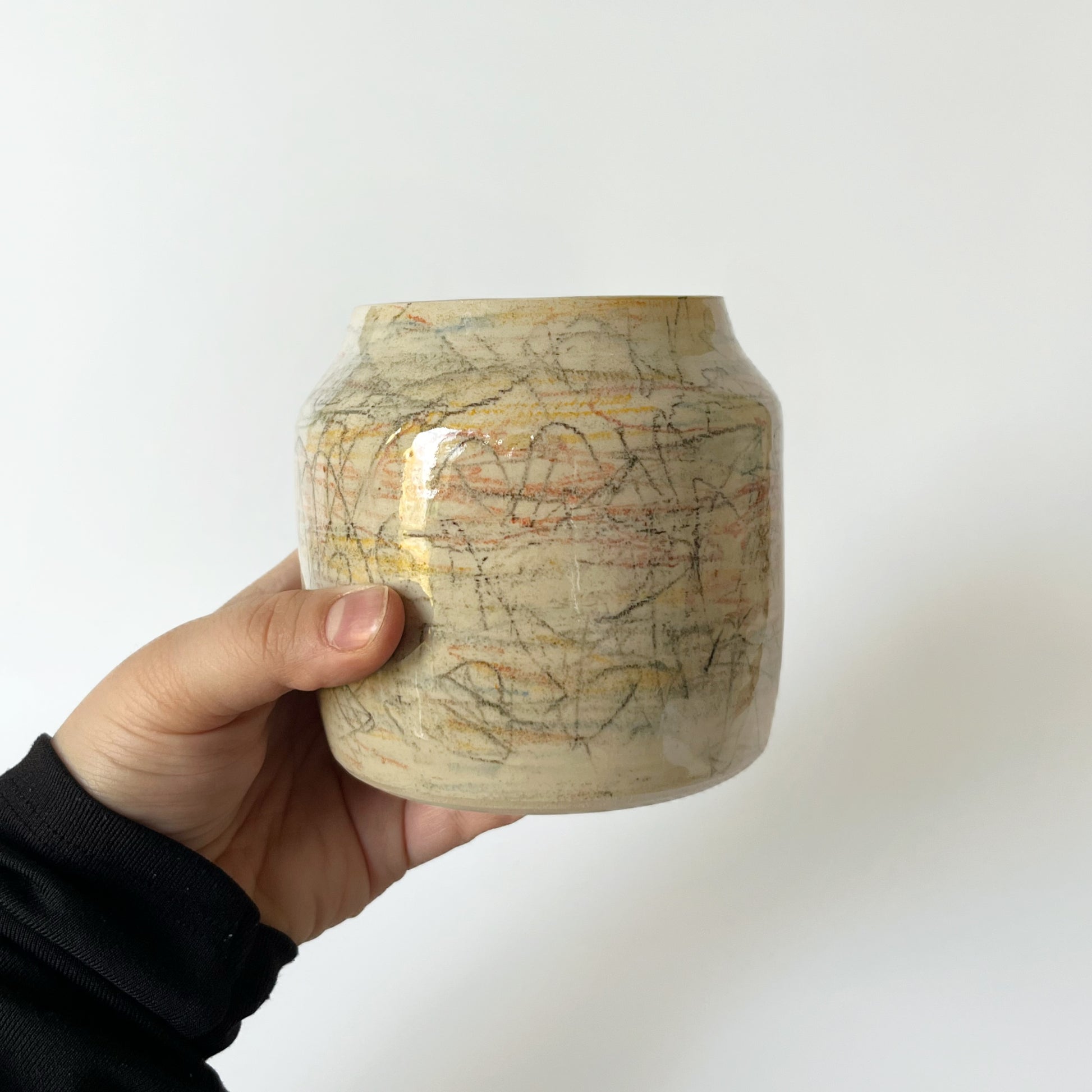 A handmade ceramic vase featuring random, multicolored scribbles.